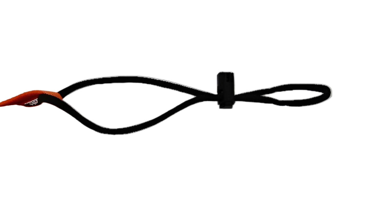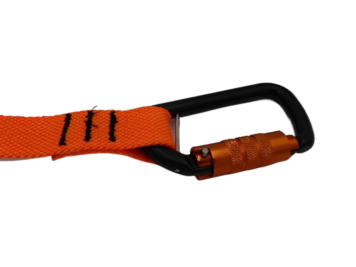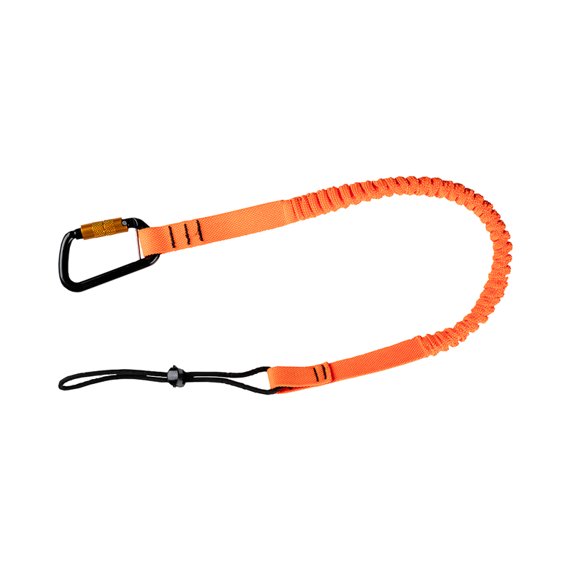 This is a tool tether that is secured (attached) to, for example, a scaffolding tube, frame, roof construction, etc.